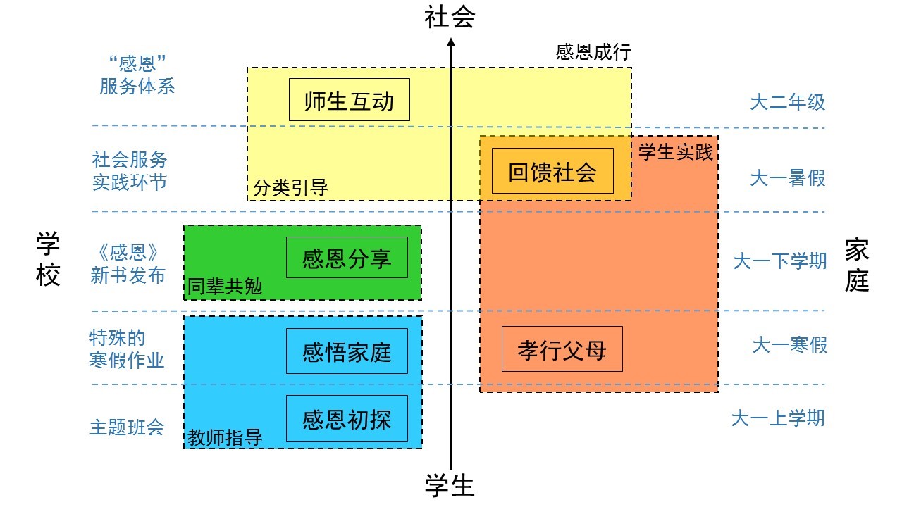 彭康书院德育实践项目,设立知、情、行“环环相扣”的感恩教育模式,构建学生、家庭、学校、社会“四位一体”的感恩教育体系,通过“六模块”“五阶段”,开设专题讲座10场/年,汇编了7本《感恩文集》和6本《寻根文集》。
