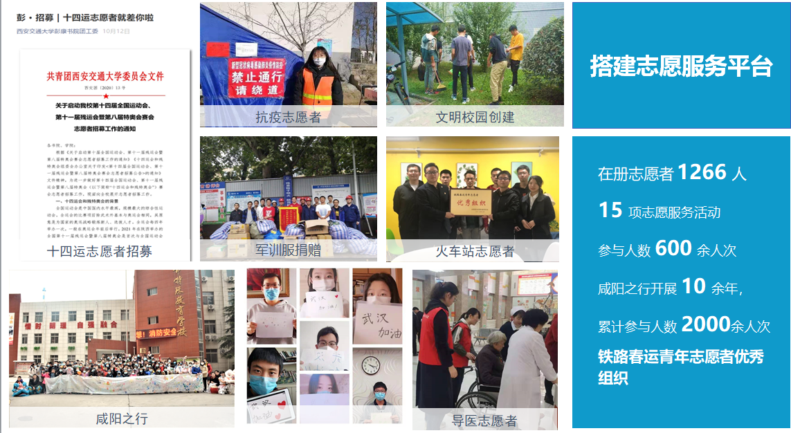 书院“彭康志愿者大队”有常驻志愿者1200余人,建有校外社会实践服务基地14个,寒暑假社会实践自主立项队伍共计125支。开展“咸阳之行”“抗疫志愿者”“火车站志愿者”“集爱于瓶”等15项志愿服务活动,引导学生积极弘扬志愿服务精神。