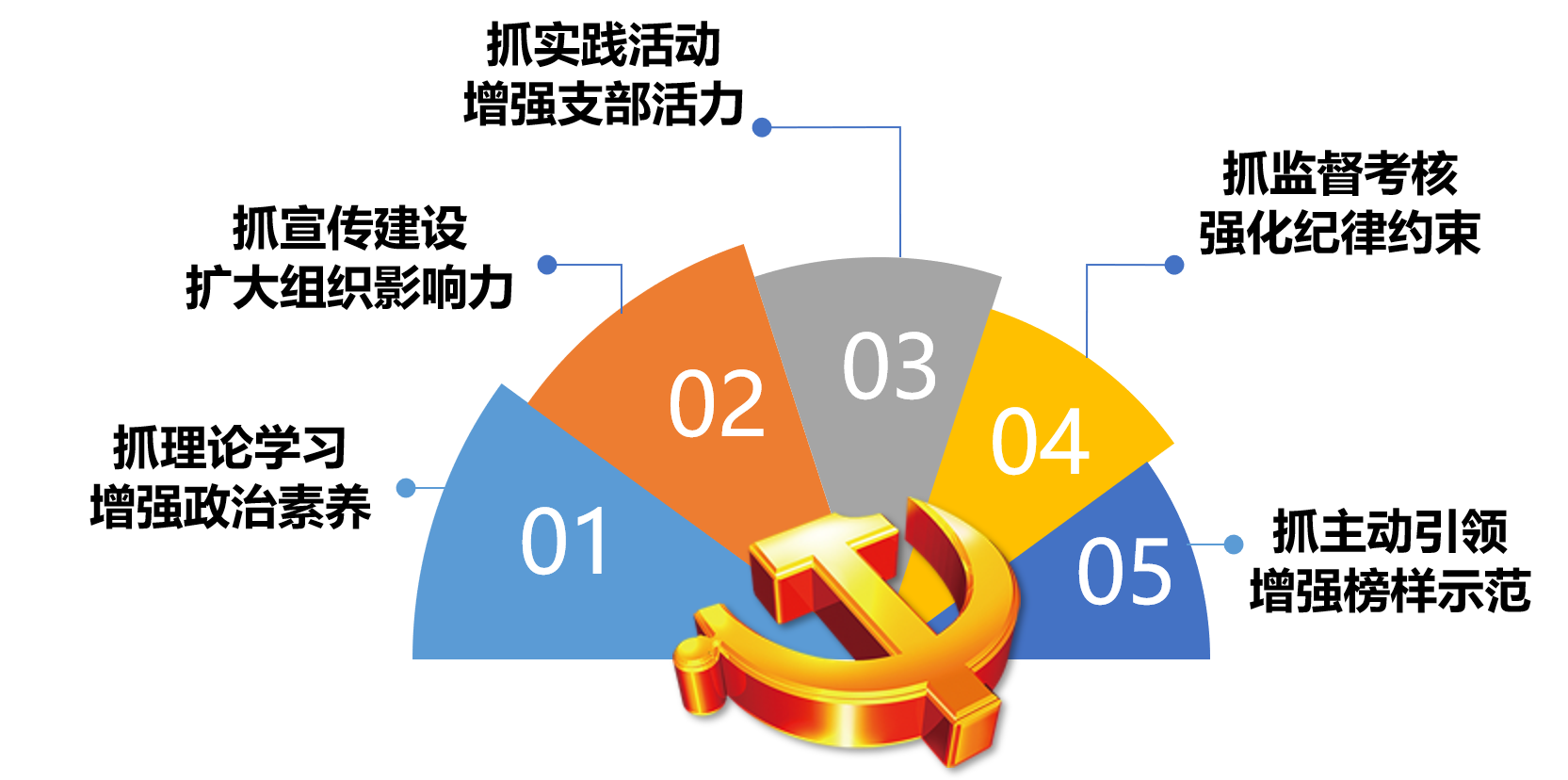“七举措”:“七个一”工程(每学期发展一批党员和积极分子、进行一次工作述职、组建一支社会实践队伍、发出一篇倡议书、联系一个支部共建;每月召开一次组织生活会、开展一次主题党日)
